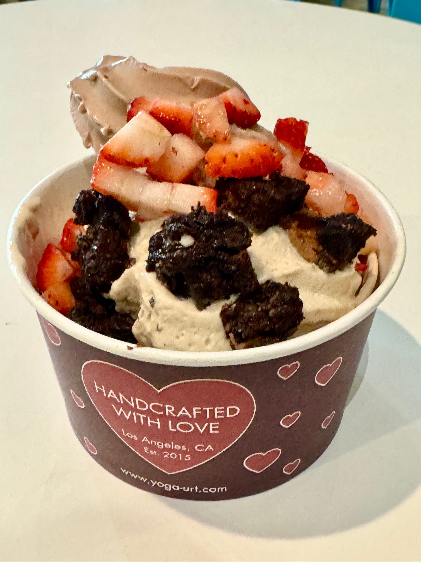 My frozen yogurt topped with brownie bites and fresh strawberries